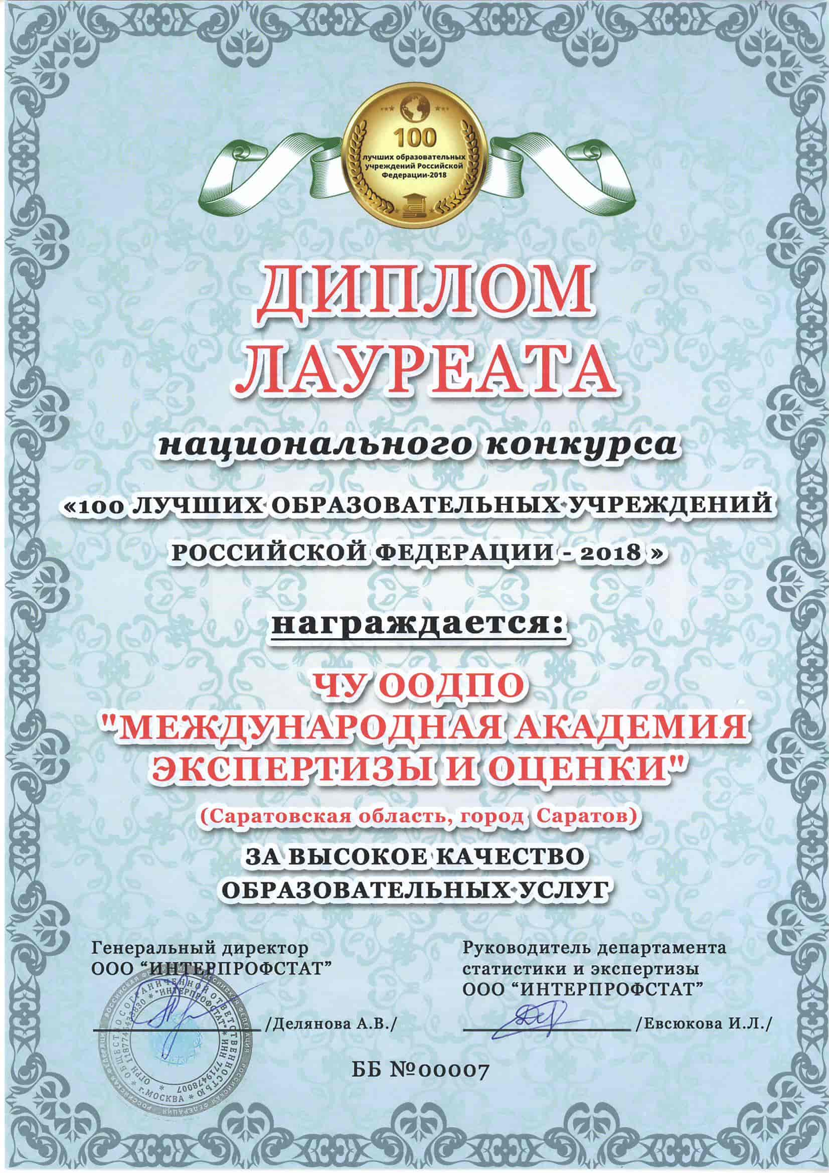 - ТОП-100 лучших образовательных учреждений России по данным Интерпрофстата в 2018 г.;
